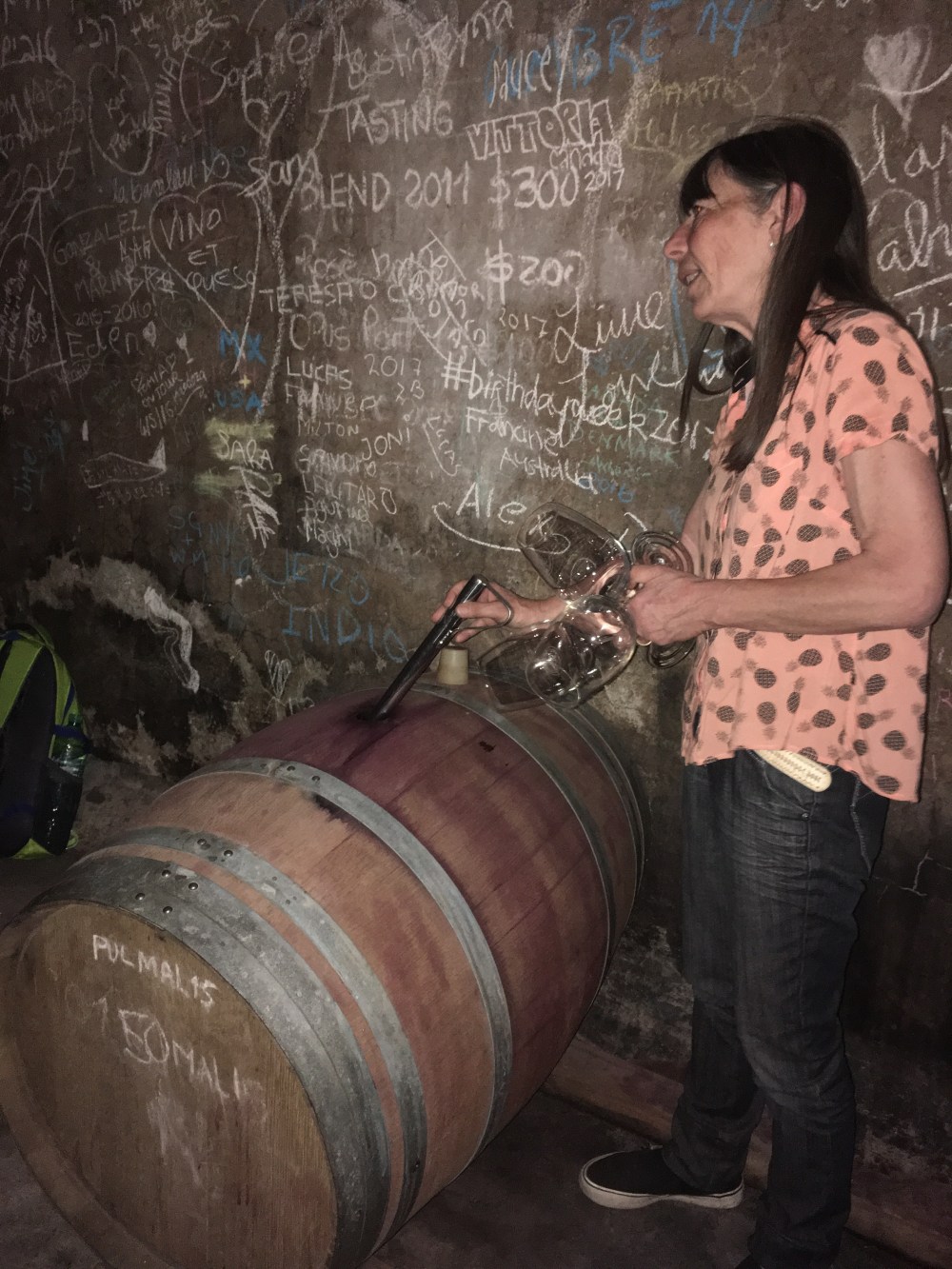 Then she opened a cork on one of the barrels and stuck a metal syringe into the hole and pulled up wine to pour into each of our wine glasses she was holding. She told us this was a 2015 Malbec that was waiting to be bottled. We each tasted the wine and it felt like it pulled all the moisture out of my tongue. Now that’s a dry wine.