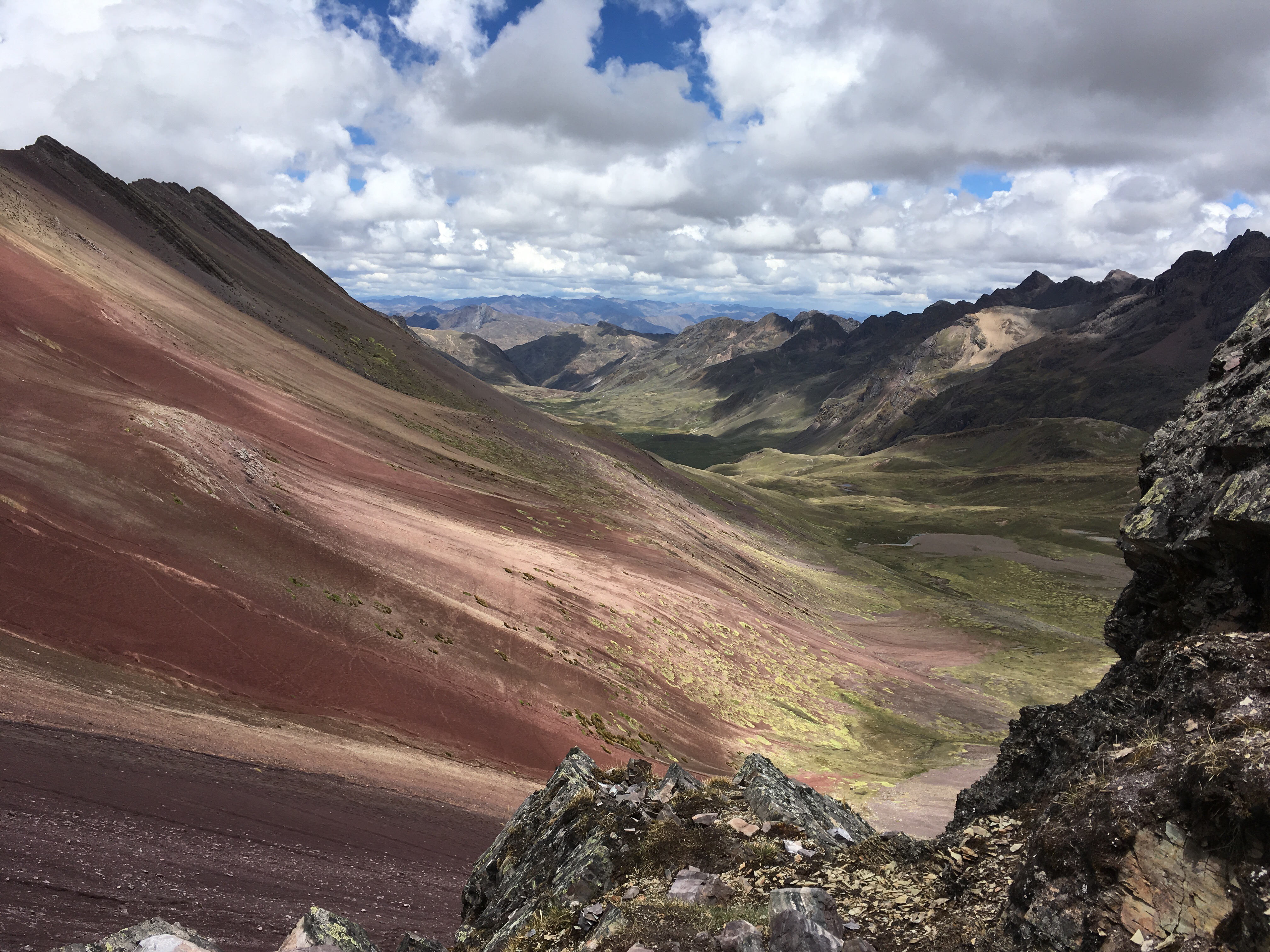 When I recovered an ounce of energy, I shakily stood up to actually see the rewarding view of the Rainbow Mountains. In either direction I could see the rolling dunes of maroon, pale yellow, white snow, and green moss on the mountains. It was unreal! It looked like a painting by a child unaware of the true colors of mountains. As a result, these tie dye masterpieces stood tall around us.