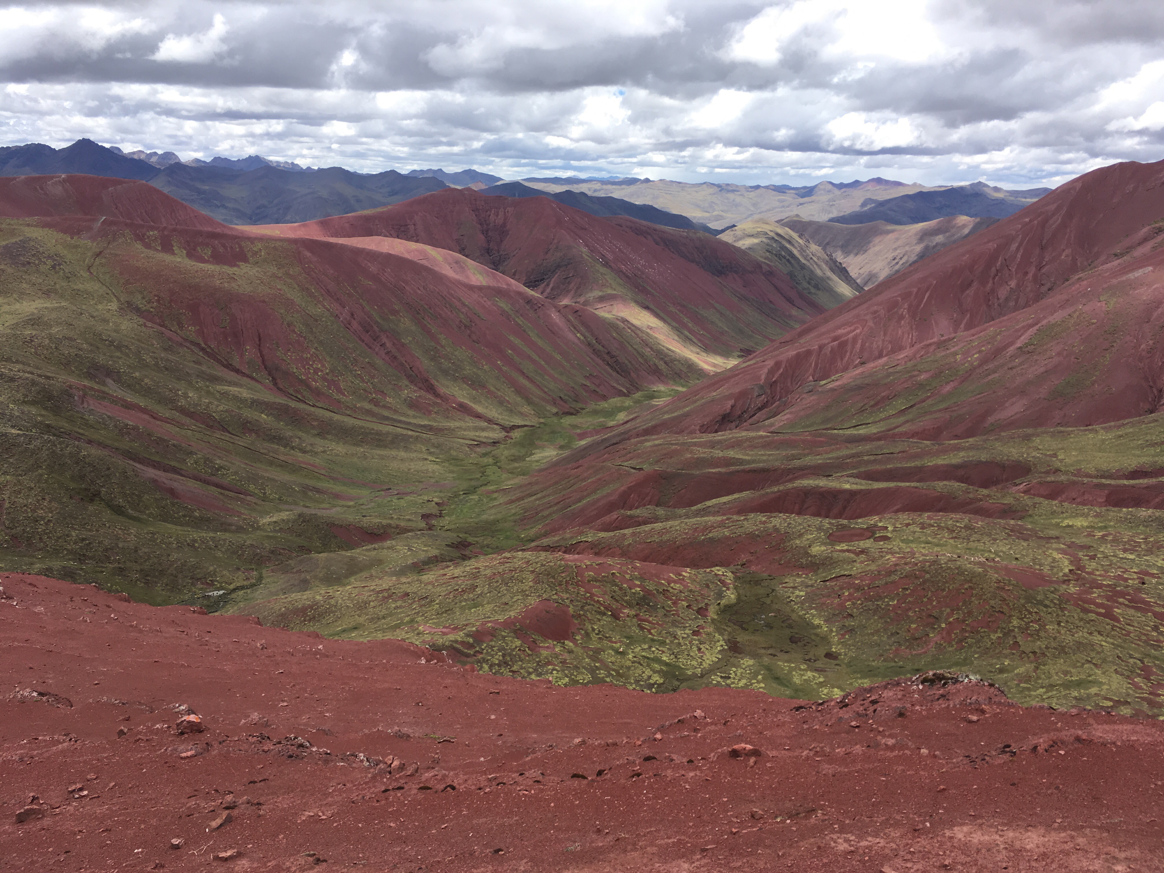 Then he lead us down the steep hill. Our feet sink into the red soil like fluffy snow, forcing us to ski down the mountain like we would on powder snow. We didn’t realize this walk through the Red Valley would be 13 miles long and feel never ending. At the beginning, we felt energized by the true magnificence of these cascading red mountains and the scenery before us of bright green moss, a snaking river, and grazing llamas and alpacas.