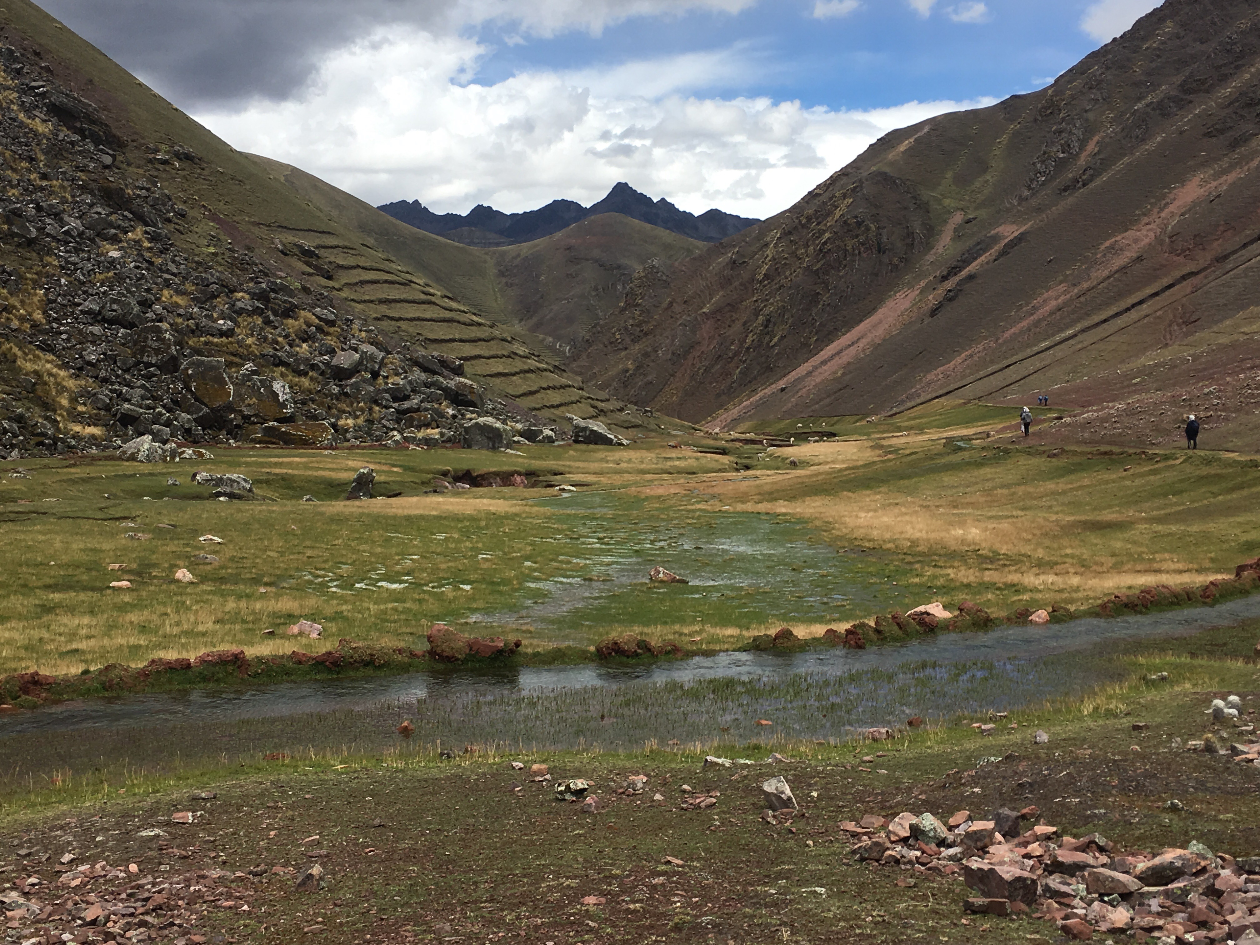 At first, we stopped every few feet to snap a picture of this spectacular landscape straight out of a fairytale. Stone houses sat in the valley with grass thatched roofs and perfectly engineered stone fences and bridges. Native women in bright colored wool skirts, silk blouses and stylish wool hats tended to their children and livestock. Fluffy brown, white, and black llamas and alpacas grazed all along the green terraced hills. Some even stopped to stare right at us. We couldn’t get enough of it until it was too much and we needed a break from walking.