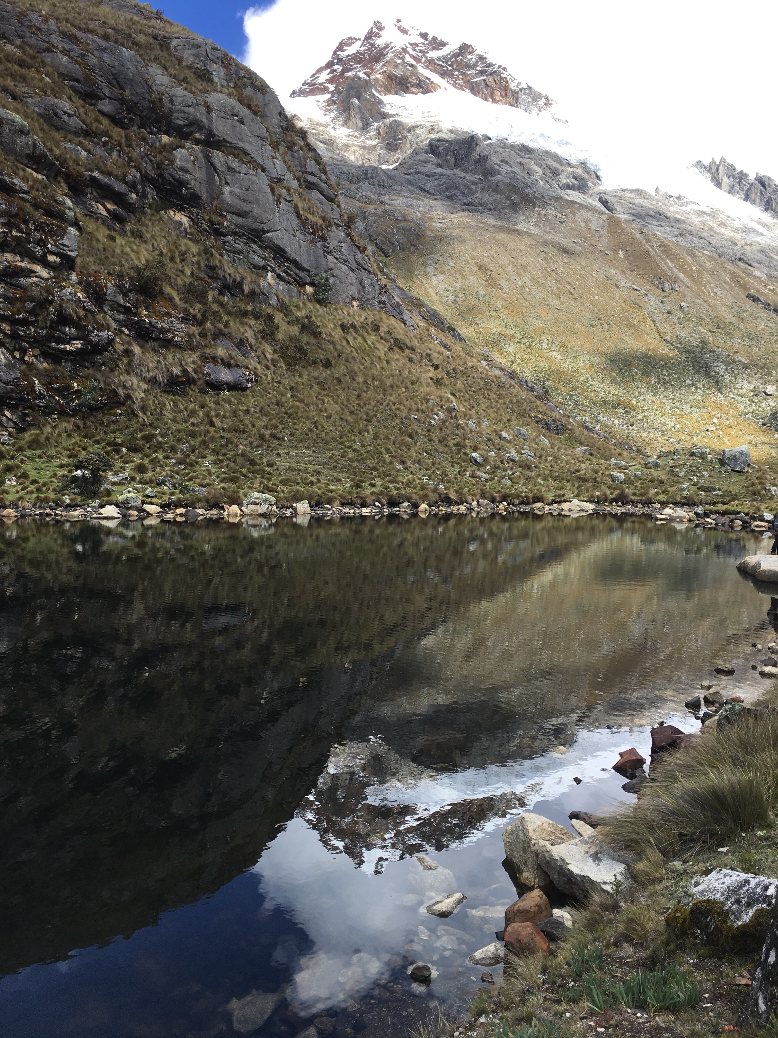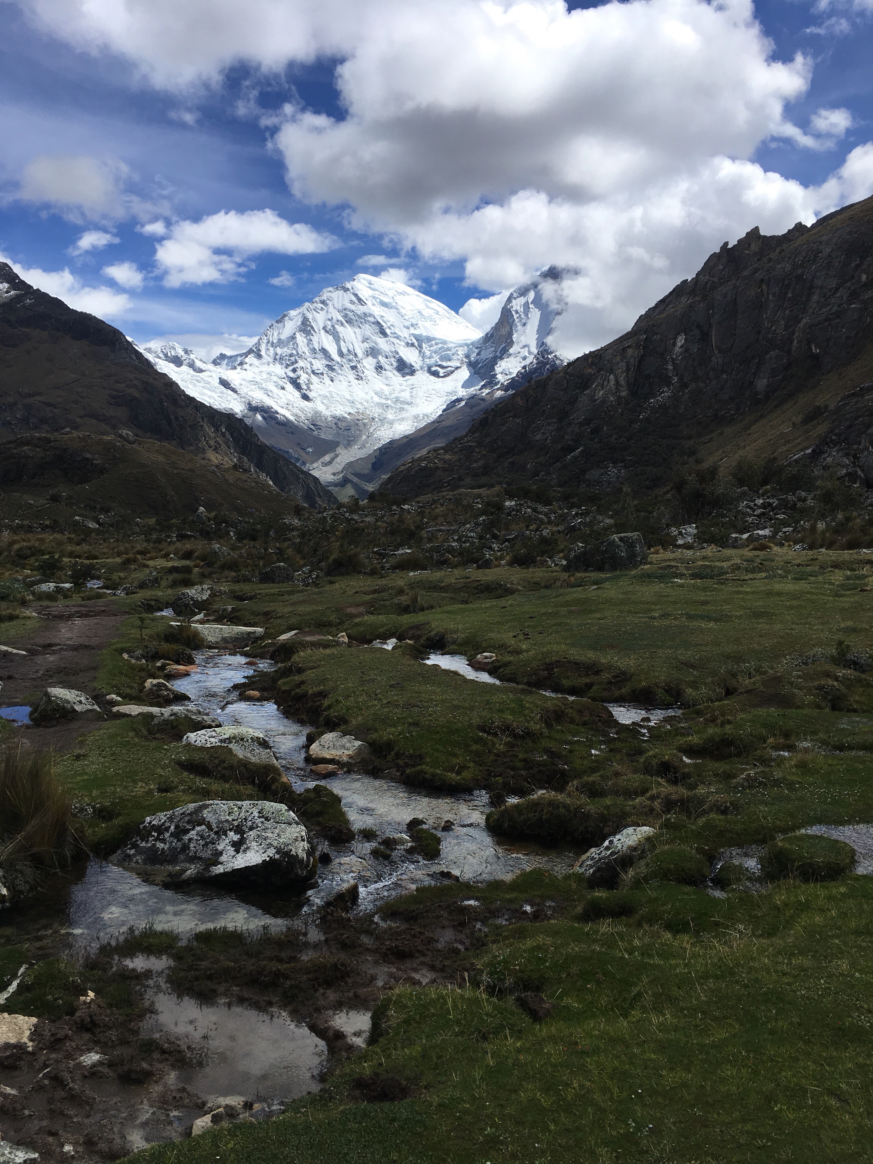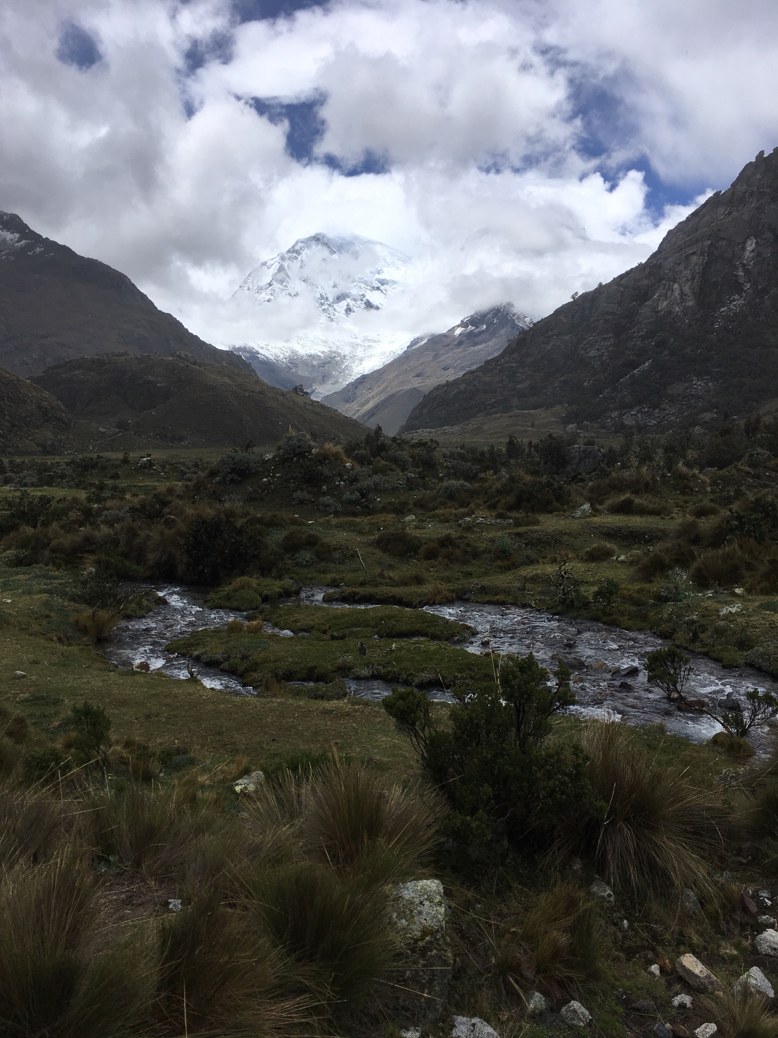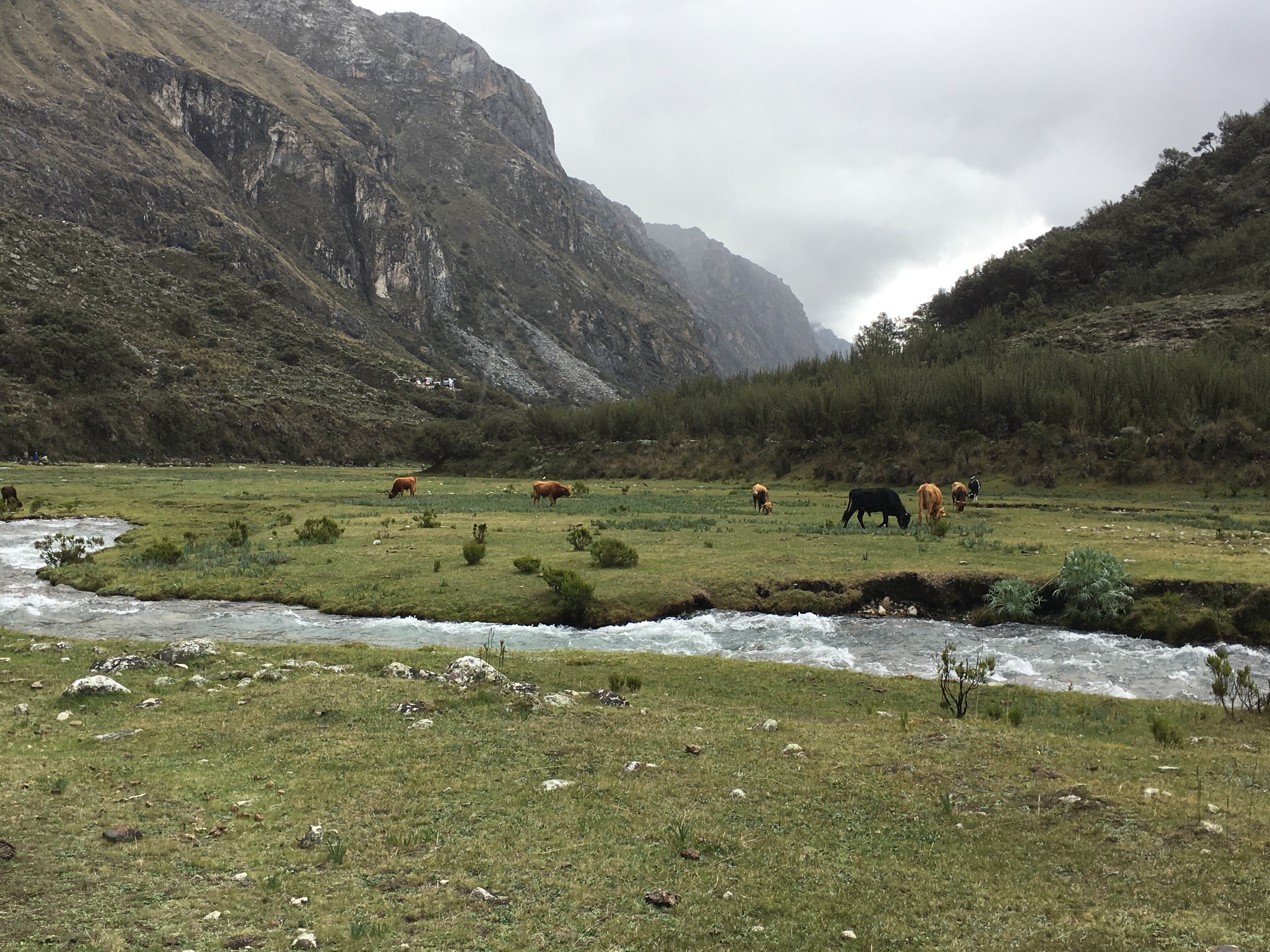 We trudged down the pass soaking wet and irritable that we must continue on to find Laguna 69. We crossed a muddy field, hopping precariously from wobbly rock to wobbly rock, occasionally slipping into the squishy mud. We did the same across the river, but with better luck. Then we reached the base of another switchback pass that we needed to climb. I sighed, wishing I stayed in bed instead of torturing myself sometimes.