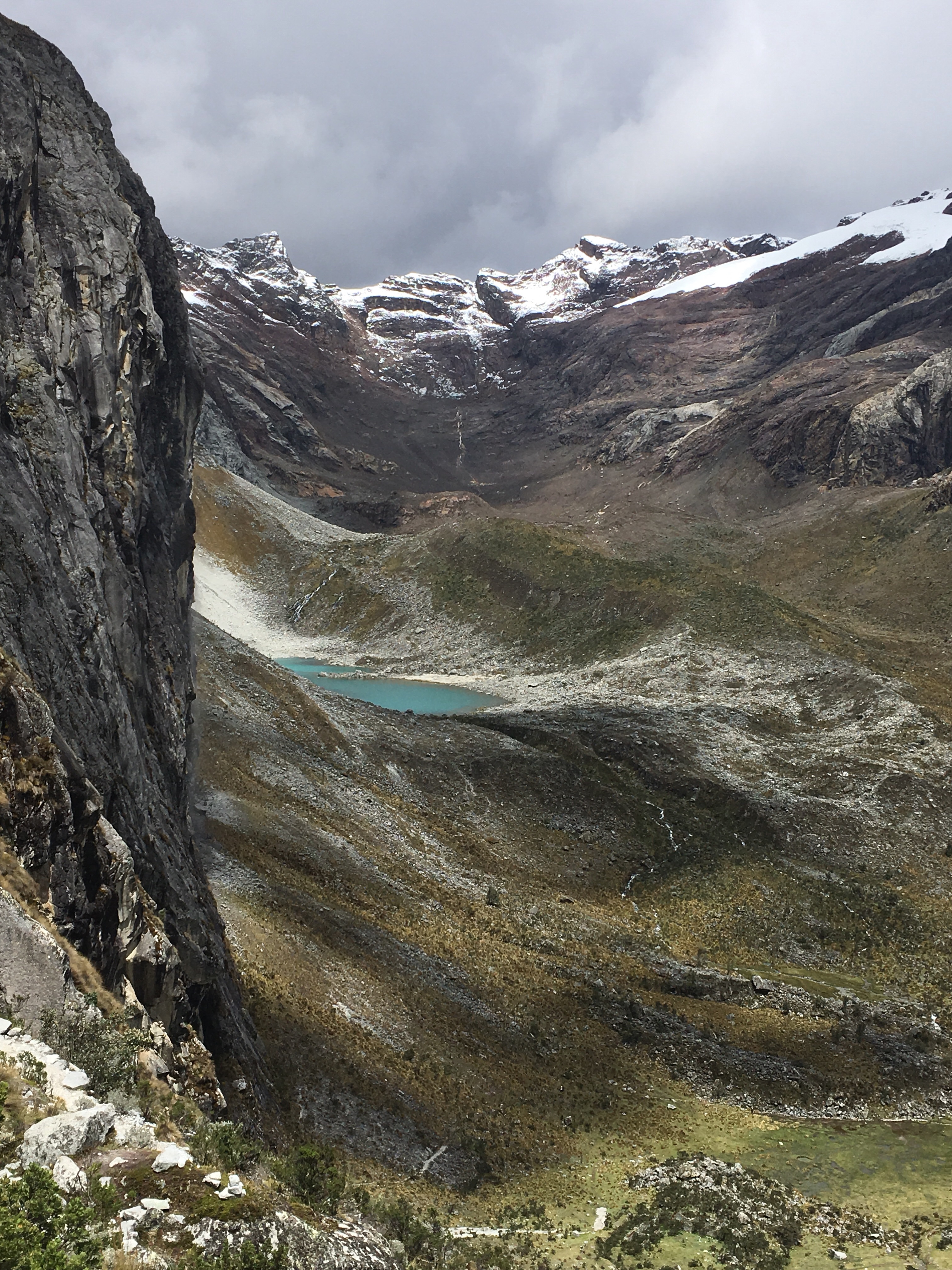 We climbed up a winding pass with the hopes that Laguna 69 sat at the top waiting for us, only to discover a false summit. Instead of Laguna 69 with its turquoise waters, we found Laguna 68 looking gray as it reflected the sky above. The rain and wind picked up full force as we stood atop this new vista. We could see the mountains wearing scarves of clouds in either direction and a glacier sitting above another turquoise pool shining like a gem in a pile of gray rocks.