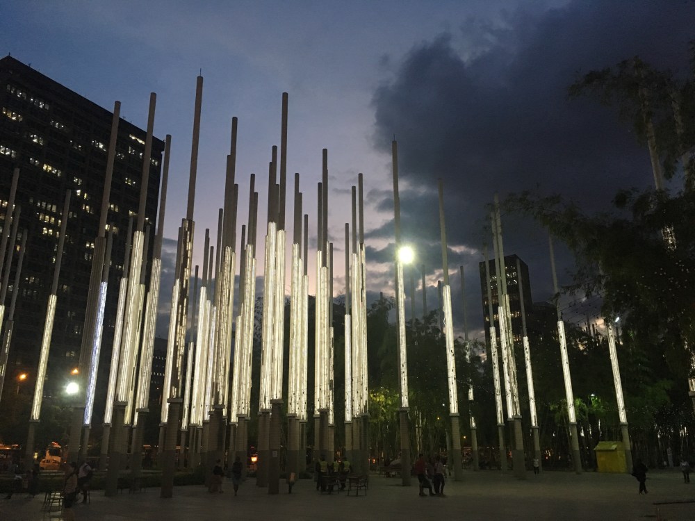 It is right in behind the Biblioteca EPM. You can enjoy a romantic stroll here at night or bring the kids to run around. It looks like a cluster of light sabers.