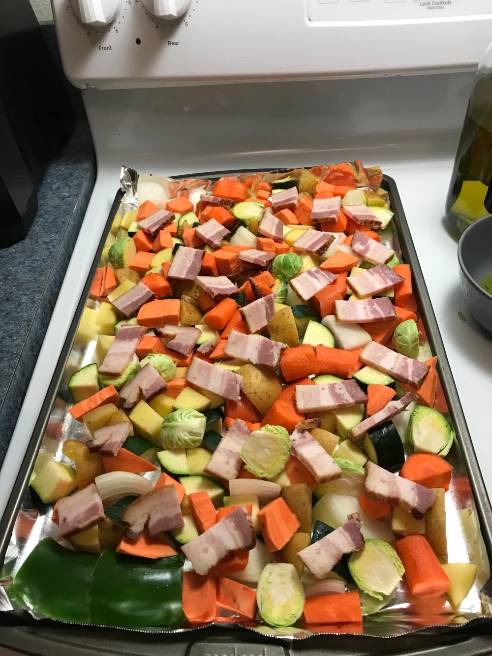 You can make it with any assortment of root vegetables and fall gourds and squashes. You just pile them on a sheet pan with chicken and bacon on top and olive oil, lemon juice, garlic, salt and pepper, and rosemary and thyme. Yum!