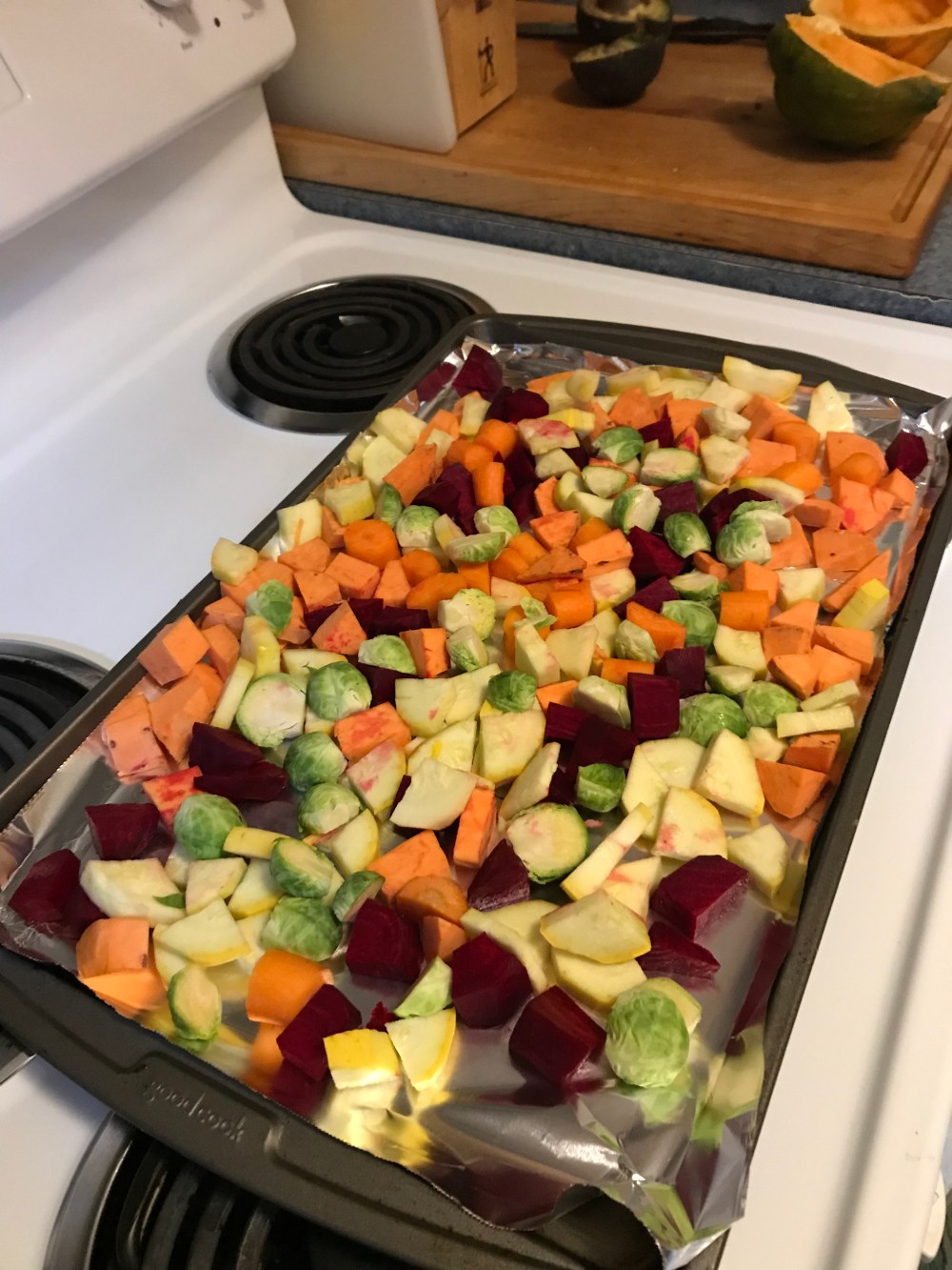 Yum! So simple and delicious! Just cut the acorn squash in half, scoop out seeds, drizzle with olive oil n turn upside down in pyrex dish. Put a little water in pan to prevent burning and cook at 400 degrees for 45-1hr. Then cut all veggies same cube size, drizzle with olive oil and spread evenly on cookie sheet. Then put in oven for a half hour.