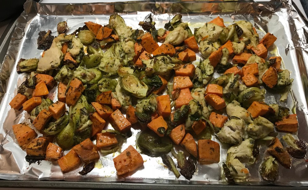 We cubed the chicken and sweet potatoes and cut the brussel sprouts in half. Put them all in a big ziploc freezer bag. Pour in olive oil, a spoonful of fresh pesto, fresh rosemary and thyme leaves, and salt, pepper, and paprika. My husband shook it all up until everything was marinaded. Then we poured the contents onto a cookie sheet on foil and spread it evenly. We baked it at 350 for 35 minutes and it came out moist and delicious.
